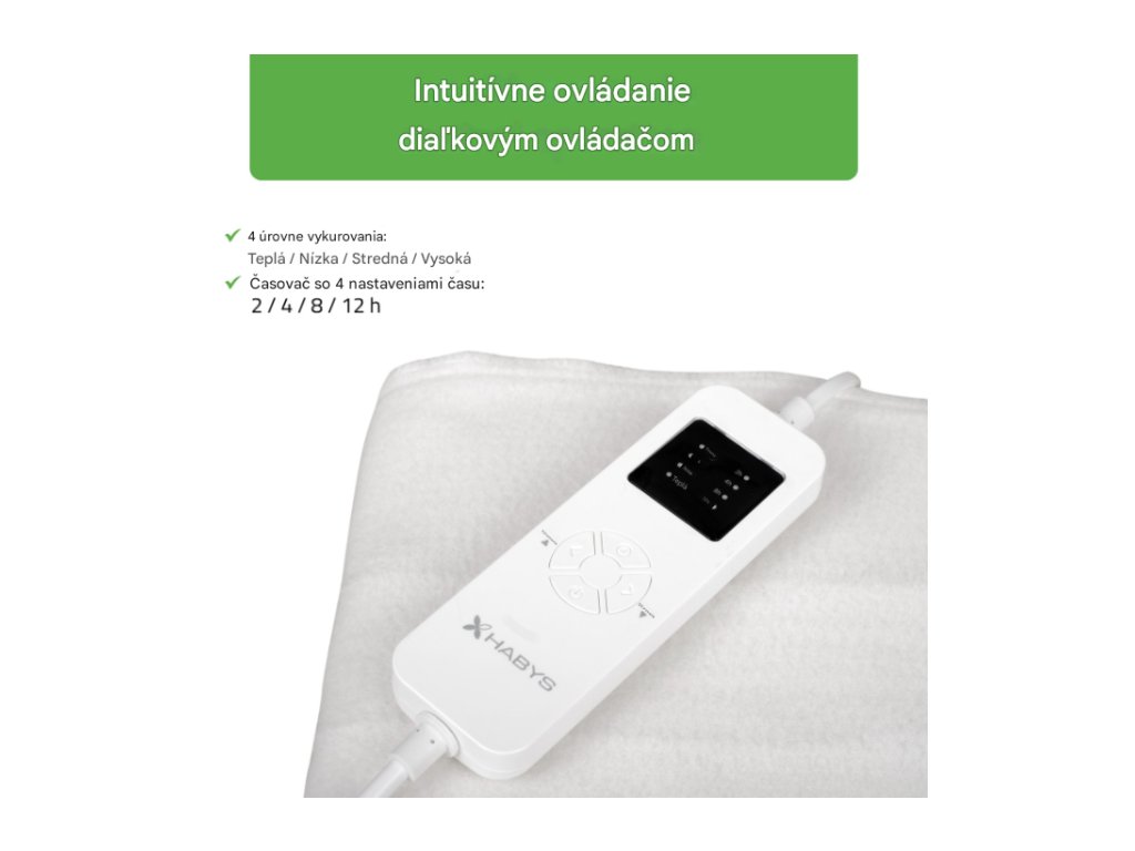 Poznámka! Vykurovací systém bol navrhnutý tak, aby sa teplo cítilo predovšetkým počas používania – pri ležaní alebo sedení na podložke. Na dotyk sa podložka môže zdať menej intenzívna, avšak pod telesnou hmotnosťou poskytuje pohodlné, príjemné a hlboko vnímateľné teplo. Ide o prirodzený účinok vykurovacích telies, ktoré najúčinnejšie prenášajú teplo pri priamom kontakte s telom. - Časovač so 4 nastaveniami času (2 / 4 / 8 / 12 h)
