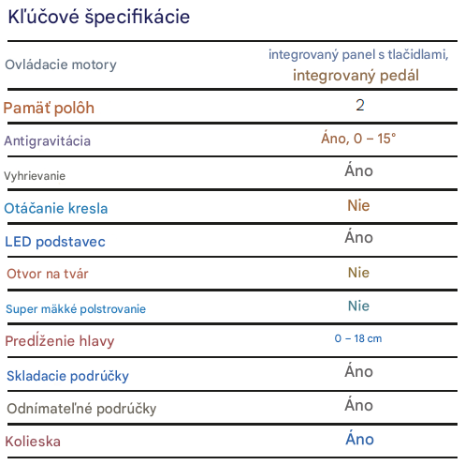 - Antigravitačná funkcia pre väčšie pohodlie počas dlhých ošetrení.