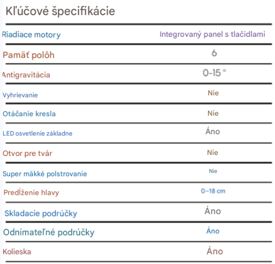 - Antigravitačná funkcia pre väčšie pohodlie počas dlhých ošetrení.
