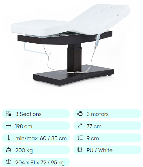 Elektrická regulácia výšky, operadla a opierky na nohy, vybavená rýchlym stĺpikovým motorom pre agilné nastavenie, ktoré umožňuje prechod z polohy na lôžku do polosedu v priebehu niekoľkých sekúnd. Jednodielny matrac s 3 sekciami, navrhnutý pre zabezpečenie maximálneho pohodlia pri masážach a ošetreniach tváre alebo tela, so zátkou pre otvor na tvár. Ovládanie pomocou ručného ovládača s funkciou resetovania pre rýchly a pohodlný prístup a vstávanie z postele. Čalúnený z PU, upevnený na elegantnom drevenom podstavci, ktorý je navrhnutý tak, aby poskytoval robustnosť, teplo a optimalizoval každodennú prácu v kabíne.
