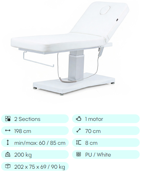 Je navrhnutý tak, aby poskytoval maximálne pohodlie a efektivitu, a je ideálny na masáže aj ošetrenia tváre a tela. Umožňuje elektrické nastavenie výšky pomocou rýchleho motora, ktorý optimalizuje každodennú prácu, okrem presného nastavenia operadla pomocou plynového piestu. Je vybavený súvislým 2-dielnym matracom navrhnutým v jednom kuse, ktorý je vybavený zátkou pre otvor na tvár.