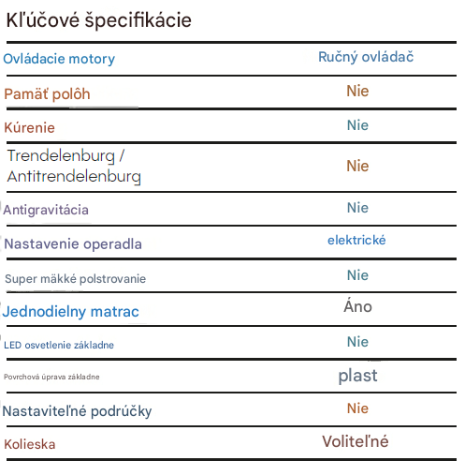 Ovládanie pomocou ručného ovládača s funkciou resetovania pre uľahčenie ukončenia ošetrenia. Čalúnený z vysoko kvalitnej, ľahko udržiavateľnej PU peny s vysokou hustotou. Integrovaný držiak na rolky.