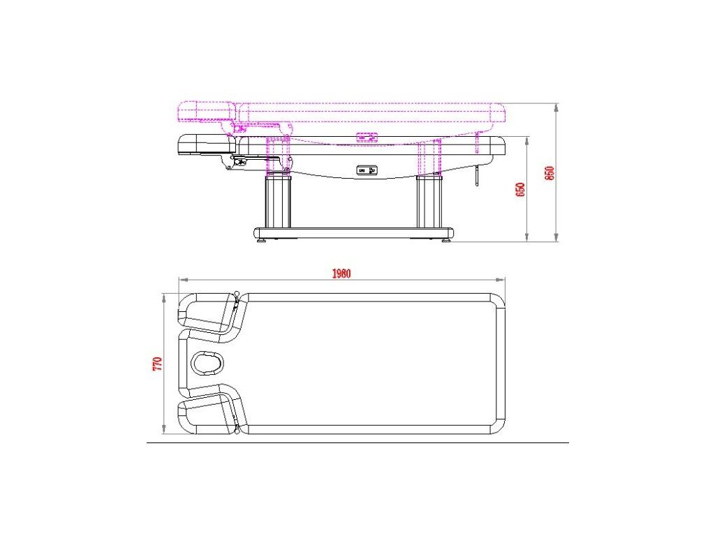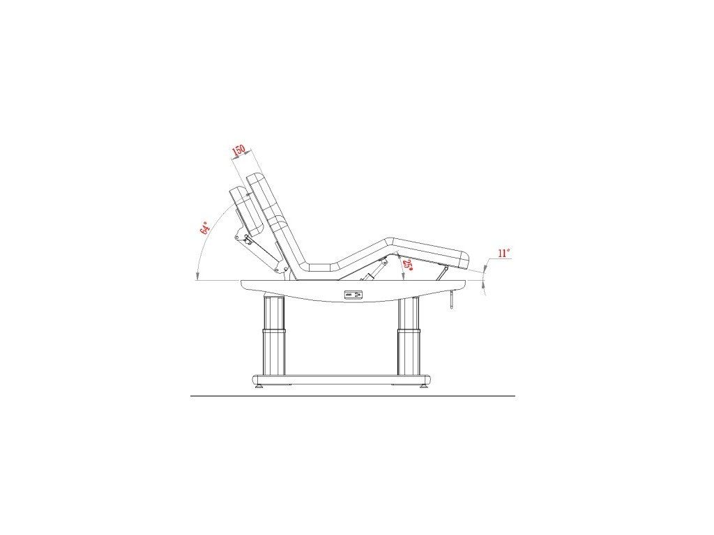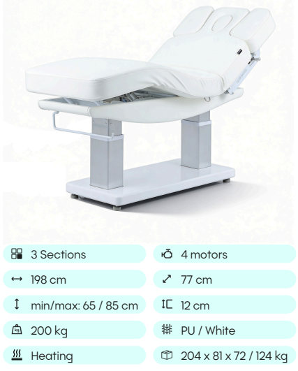 Elektrické nastavenie výšky, operadla a opierky na nohy s polohami Trendelenburg, Anti-Trendelenburg a Antigravity. Jeho rýchly stĺpikový motor umožňuje plynulé nastavenie do viacerých polôh, čím optimalizuje každodennú prácu v kabíne. Jednodielny 3-dielny matrac s výplňou SuperSoft, navrhnutý pre maximálne pohodlie pacienta. Je vybavený zátkou pre otvor na tvár, ako aj nezávisle nastaviteľným systémom lakťových opierok, ktorý zlepšuje relaxáciu krčnej chrbtice počas ošetrení tvárou nadol. Ovládanie pomocou ručného ovládača s funkciou resetovania a digitálnym displejom pre presné nastavenie teploty. Čalúnený z PU, s penou s vysokou hustotou a upevnený na elegantnom bielom drevenom podstavci.