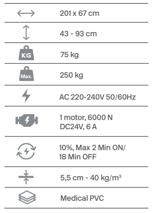 Agila 2 je 2-segmentový elektrický ošetrovací stôl s nožným ovládaním bez chôdze a dizajnom pre pohodlný prístup k pacientovi pri zachovaní optimálnej stability.