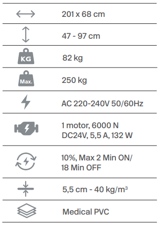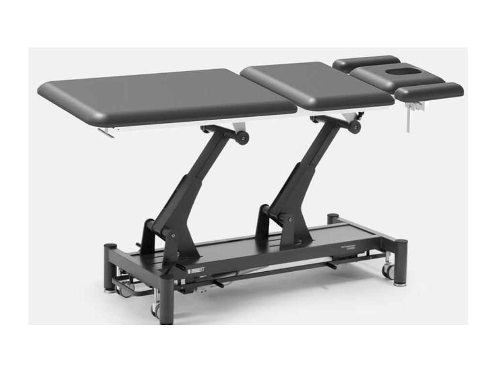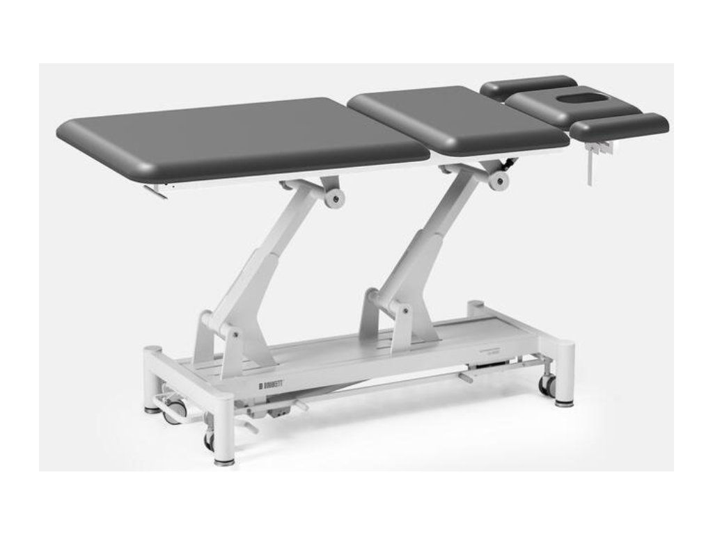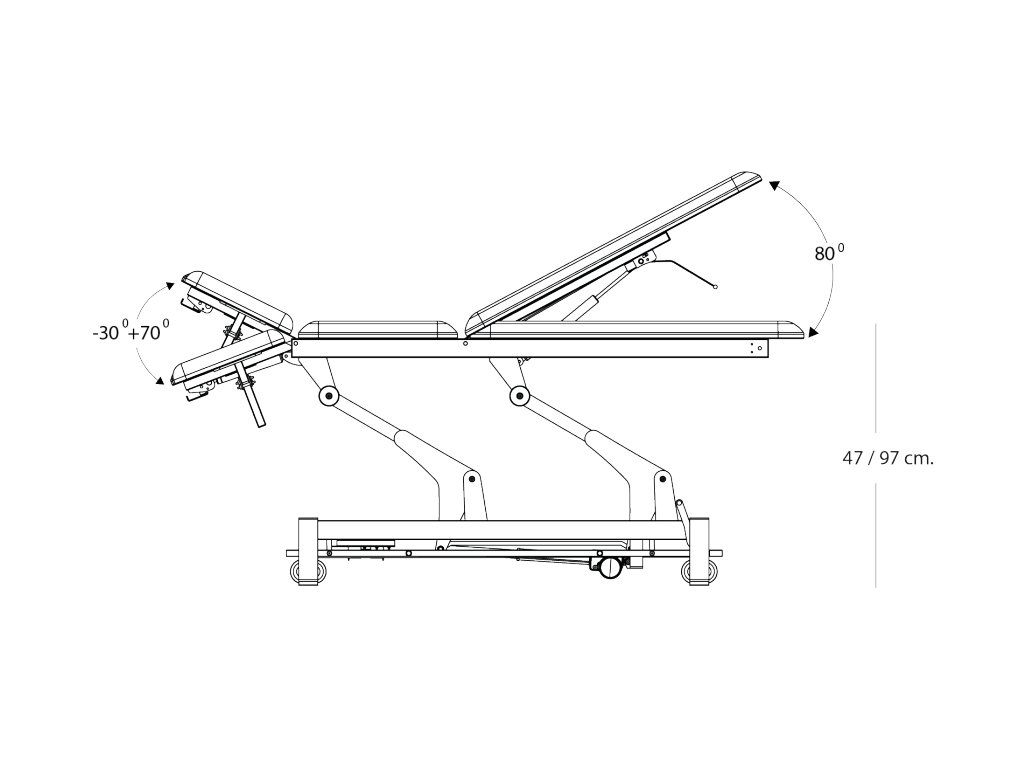 Elektrický 2dílný osteopatický stůl s bočními sklopnými područkami. Nastavitelná hlavová část v kladných a záporných úhlech pro ošetření děložního čípku. Pracovní šířka je 55 cm...