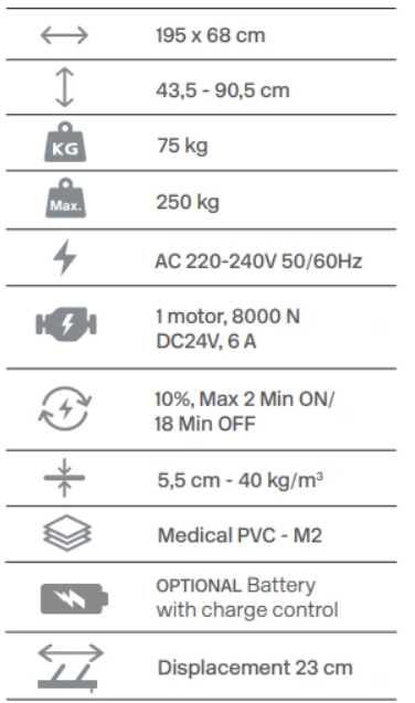 ‑ Výškovo nastaviteľná poloha od 43,5 cm do 90,5 cm v horizontálnej polohe pomocou ručného ovládača.
