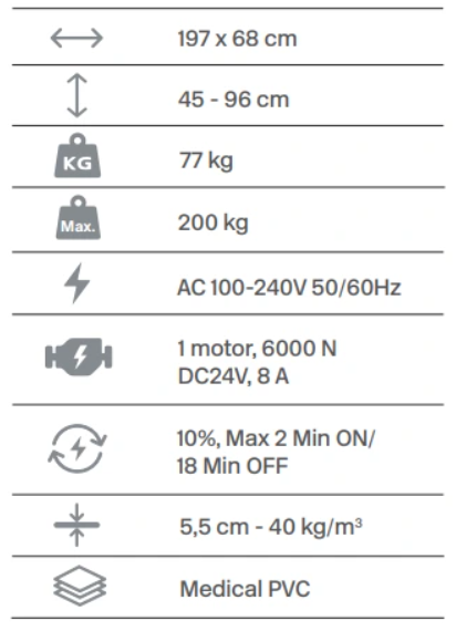 Terapeutický stôl vybavený 5-dielnou doskou, ERGO vankúšom, ručným ovládaním a ovládaním obvodového rámu, určený na použitie v profesionálnej masážnej, fyzioterapeutickej a...
