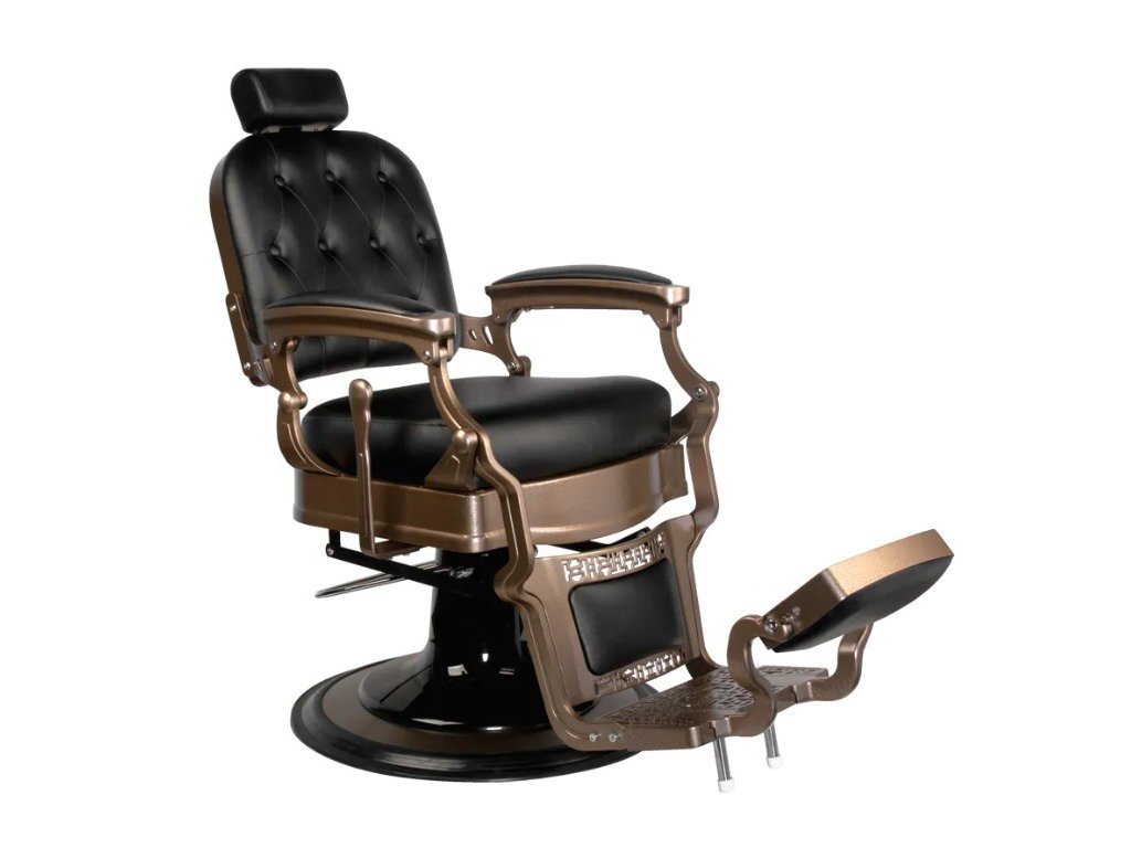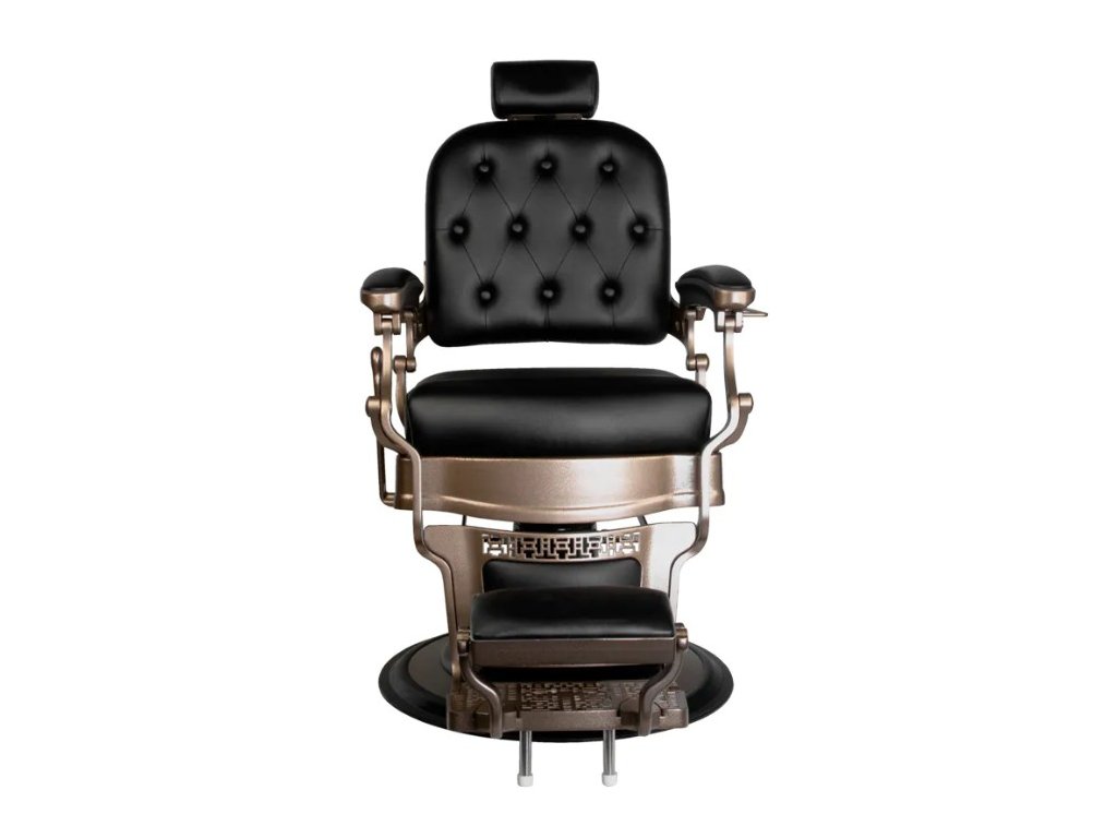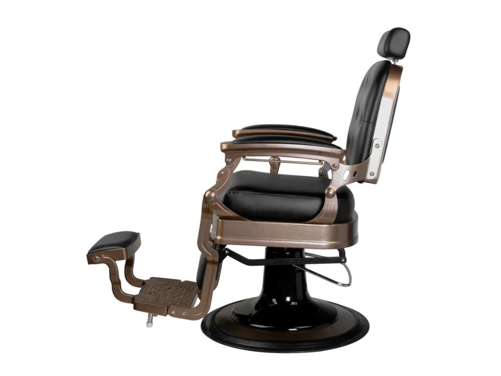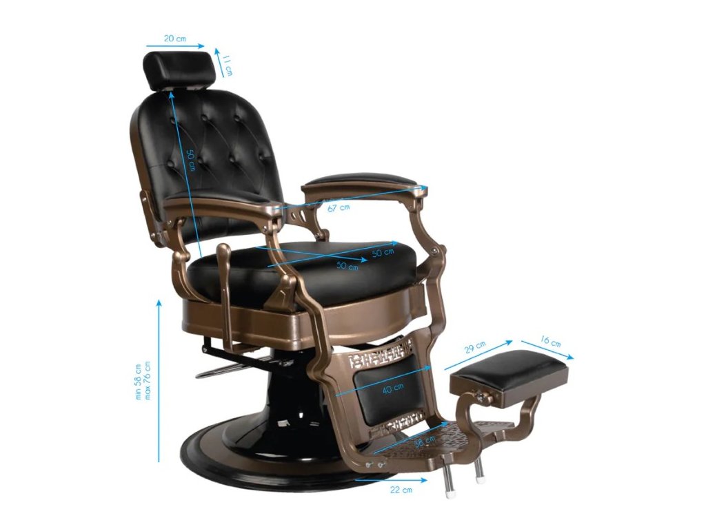 Pevná konštrukcia základne zaisťuje stabilitu a vysoký komfort používania. Sedadlo je vyplnené odolnou penou odolnou voči deformácii a čalúnené syntetickou kožou, ktorá je príjemná na dotyk, odolná voči oderu a nenáročná na údržbu, zaisťuje odolnosť nábytku a pohodlie na najvyššej úrovni. Vďaka použitým materiálom je stolička odolná voči vlhkosti, odolná a ľahko sa čistí. Štýlové čalúnenie v odtieňoch čiernej, ozdobné prešívanie s gombíkmi na operadle a elegantná podnožka dodávajú kreslu jedinečný charakter. Jeho dizajn inšpirovaný vintage dokonale zapadá do atmosféry klasických holičských salónov a zdôrazňuje ich jedinečnú atmosféru. Rafinované detaily, originálna textúra čalúnenia a pevný podklad zaisťujú nielen estetiku, ale aj maximálnu stabilitu. Ide o kombináciu elegancie a funkčnosti, ktorá splní očakávania aj tých najnáročnejších profesionálov.