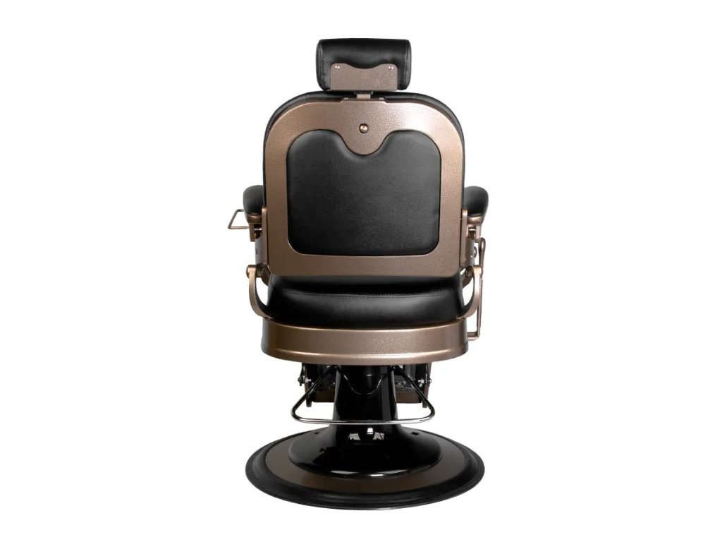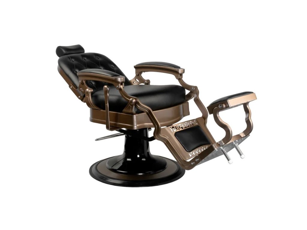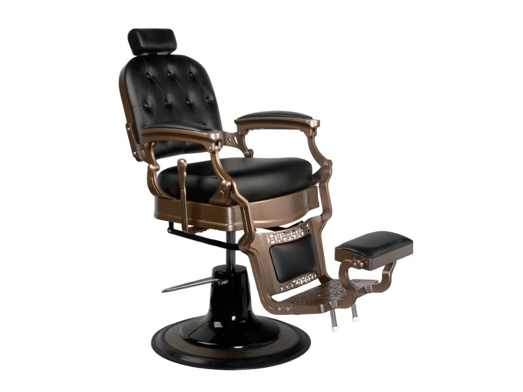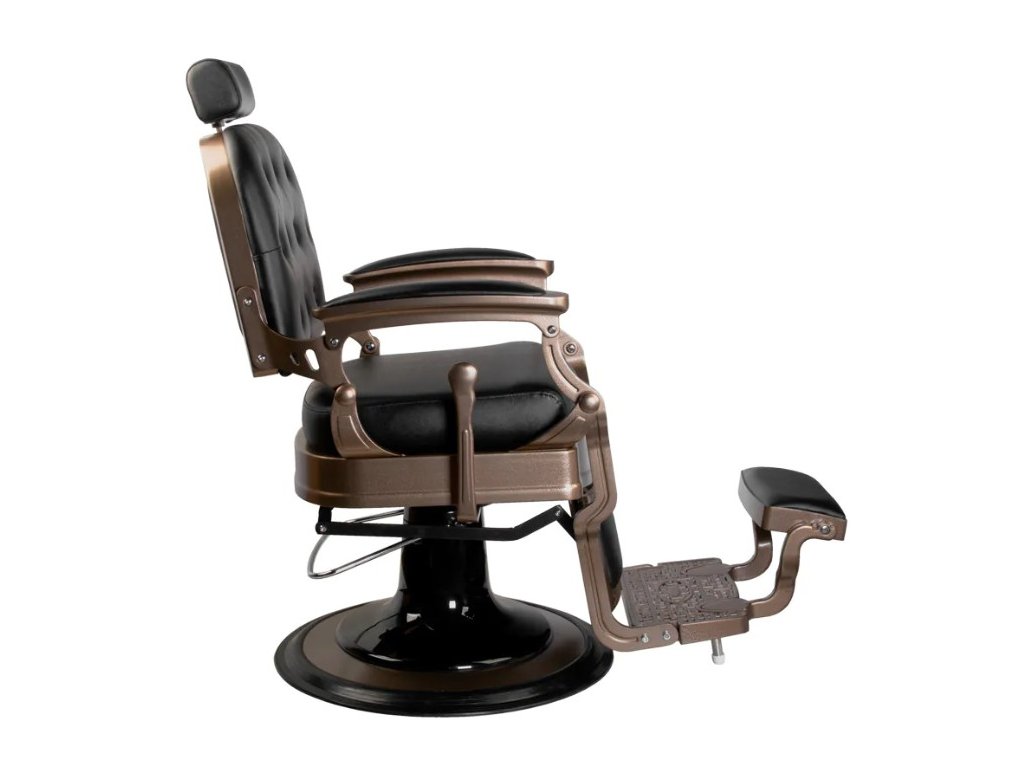 Pevná konštrukcia základne zaisťuje stabilitu a vysoký komfort používania. Sedadlo je vyplnené odolnou penou odolnou voči deformácii a čalúnené syntetickou kožou, ktorá je príjemná na dotyk, odolná voči oderu a nenáročná na údržbu, zaisťuje odolnosť nábytku a pohodlie na najvyššej úrovni. Vďaka použitým materiálom je stolička odolná voči vlhkosti, odolná a ľahko sa čistí. Štýlové čalúnenie v odtieňoch čiernej, ozdobné prešívanie s gombíkmi na operadle a elegantná podnožka dodávajú kreslu jedinečný charakter. Jeho dizajn inšpirovaný vintage dokonale zapadá do atmosféry klasických holičských salónov a zdôrazňuje ich jedinečnú atmosféru. Rafinované detaily, originálna textúra čalúnenia a pevný podklad zaisťujú nielen estetiku, ale aj maximálnu stabilitu. Ide o kombináciu elegancie a funkčnosti, ktorá splní očakávania aj tých najnáročnejších profesionálov.