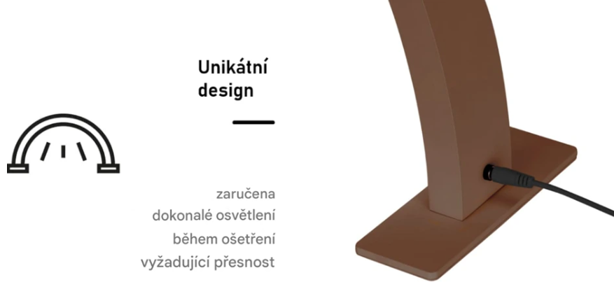 Charakteristický tvar hlavy lampy ponúka zaujímavý dizajn, ktorý zároveň zaručuje vysokú funkčnosť. Široký, unikátne zakrivený profil, osadený 582 LED diódami, poskytuje osvetlenie ošetrovanej oblasti bez tieňov , čo zaisťuje vysoký komfort počas ošetrenia. Je tiež ideálna na fotografovanie účinkov, čím ich jasne zvýrazňuje . Mliečny, priesvitný povrch panelu dobre rozptyľuje svetlo a zabraňuje oslneniu. Vhodné parametre a nastaviteľná intenzita svetla zabezpečujú vynikajúcu reprodukciu farieb , vďaka čomu lampa nespôsobuje namáhanie očí ani pri dlhodobom používaní.