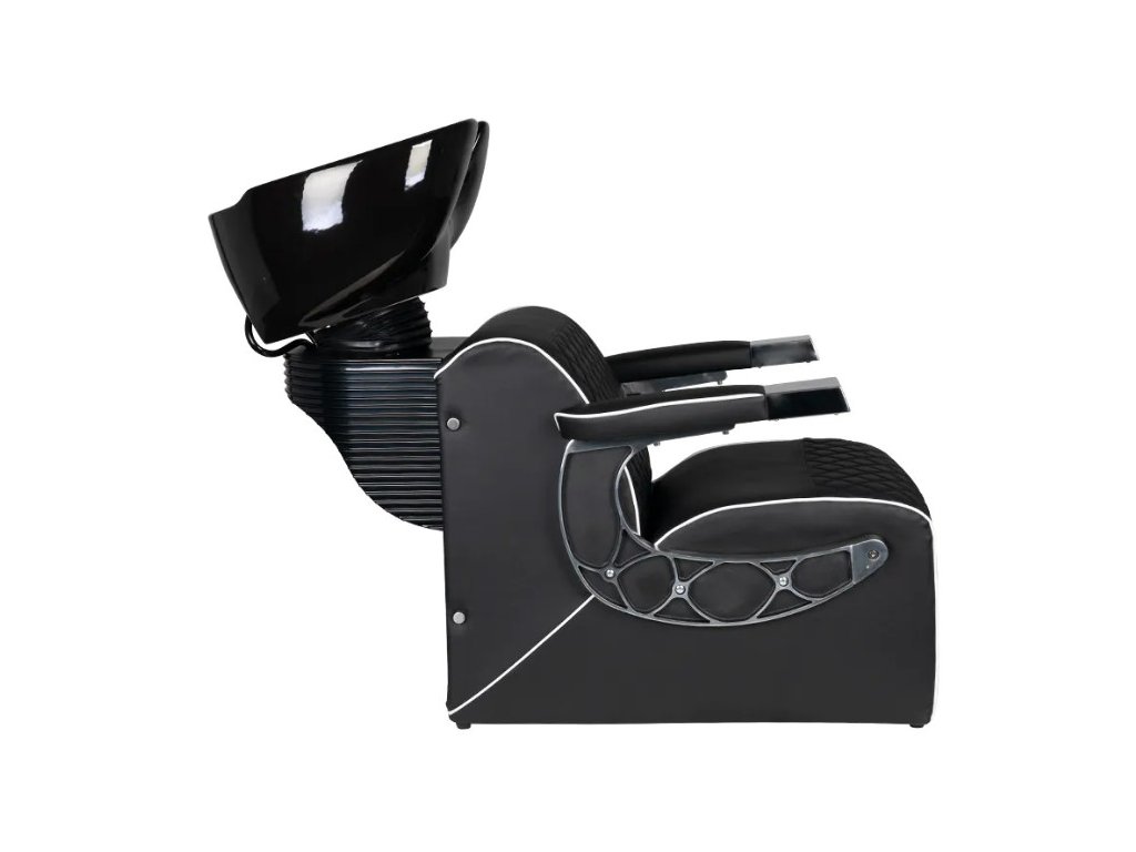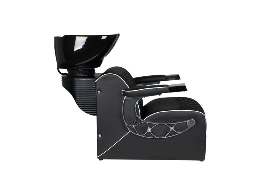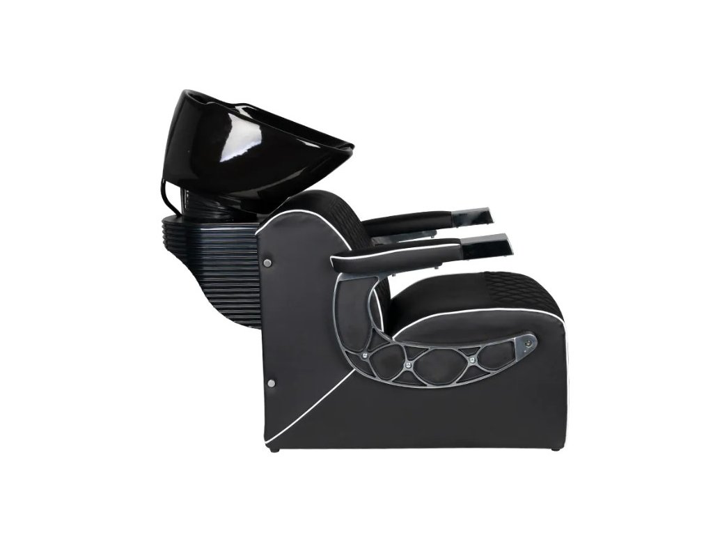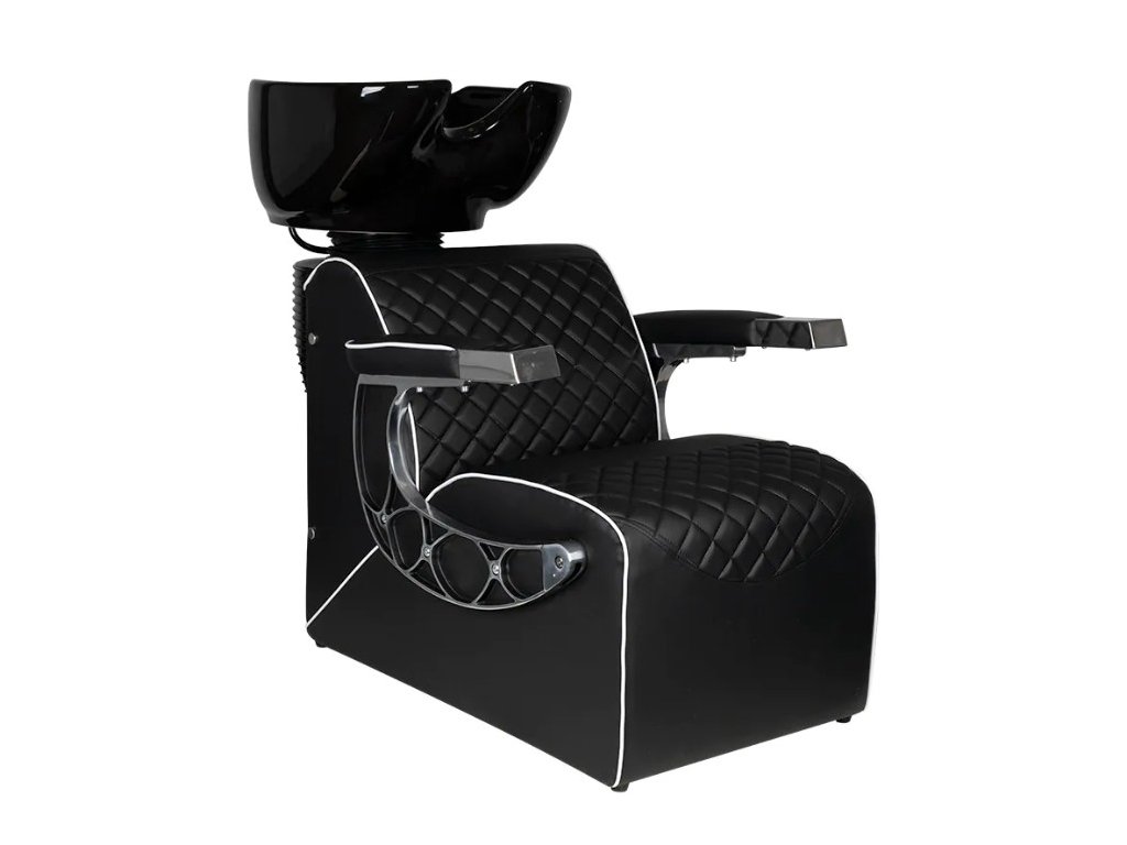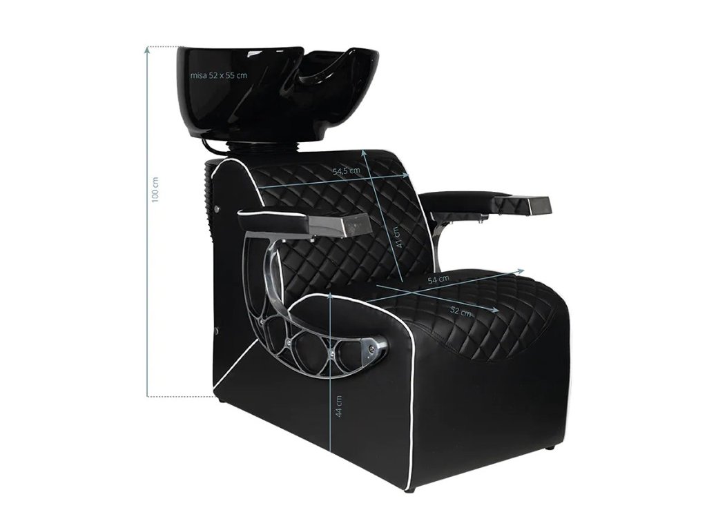 Elektricky polohovateľné šampónové kreslo s integrovaným ovládacím panelom, navrhnuté pre pohodlie klienta pri dlhších ošetreniach.