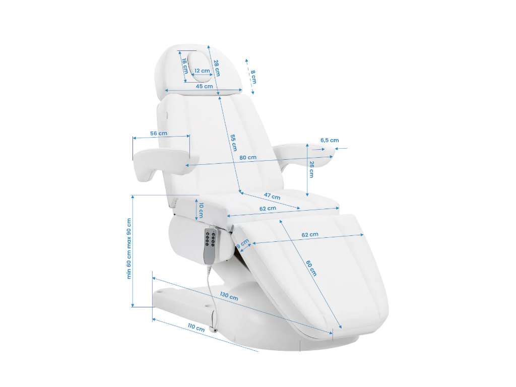 Elektrické kozmetické kreslo Azzurro Lux je vybavené 4 aktuátormi ovládanými káblovým diaľkovým ovládačom, ktorý umožňuje plynulé a presné nastavenie jednotlivých prvkov. Intuitívne ovládanie a široká škála nastavení uľahčujú prispôsobenie kresla potrebám klienta aj lekára. Kreslo sa vyznačuje stabilitou a všestrannosťou, vďaka čomu je ideálne pre kozmetické ordinácie, podiatriu a estetickú medicínu.