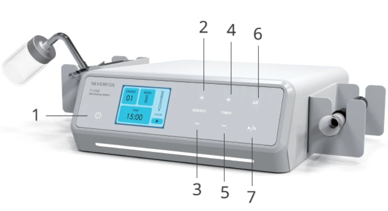 1. Zasuňte vzduchovú trubicu do zásuvky pre vzduchovú trubicu na hlavnej jednotke. Po správnom pripojení zariadenia k napájaciemu káblu sa „Vypínač napájania“ zobrazí na červeno. Stlačením „Vypínača napájania“ prejdite do prevádzkového režimu a na obrazovke sa zobrazí bielo. Zariadenie je v predvolenom stave výstupu; výstupná energia úrovne 1 je teda nastavený na 15 minút.