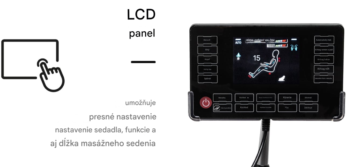 Prehľadný ovládací panel s LCD obrazovkou zaisťuje jednoduché a intuitívne ovládanie kresla . Panel sa dá pohodlne umiestniť na rukoväť namontovanú na pravej lakťovej opierke alebo držať v rukách. Prehľadný displej zobrazuje aktuálnu prevádzku zariadenia vrátane masírovaných oblastí, intenzity masáže, času ošetrenia a zvoleného programu. Panel umožňuje presné nastavenie kresla a masážnych funkcií, ako aj výber dĺžky sedenia , ktorá môže byť 5, 10, 15, 20, 25 alebo 30 minút.