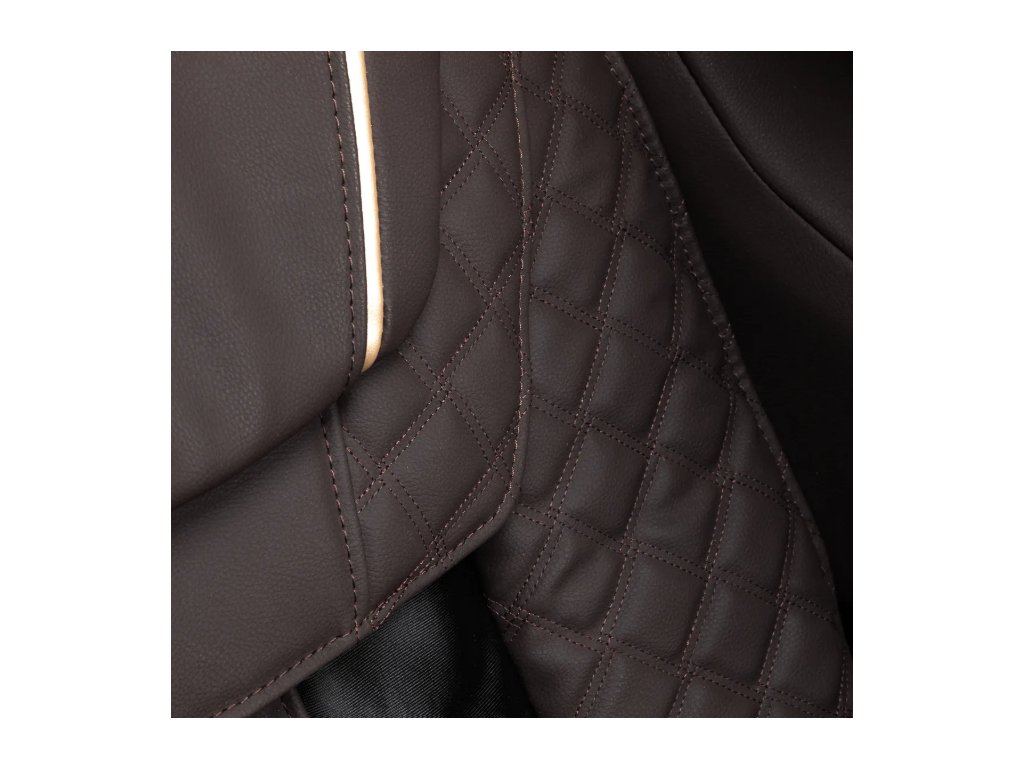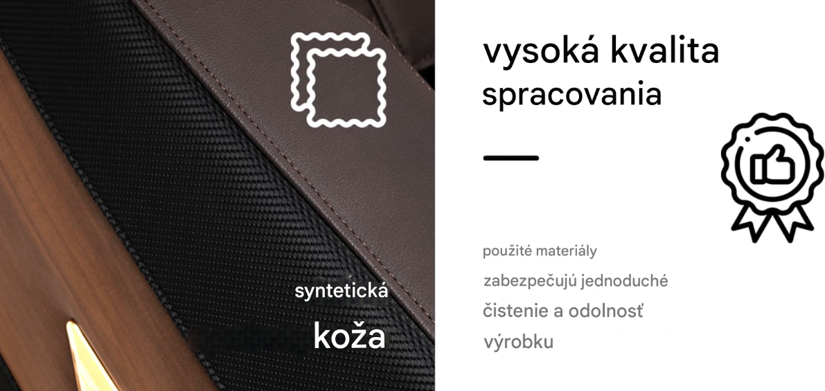 Interiér kresla je čalúnený mäkkou, tmavohnedou imitáciou kože . Tento materiál je vysoko odolný voči vlhkosti a ľahko sa čistí , čo zaisťuje pohodlné používanie. Kombinácia syntetickej kože imitujúcej drevo a textúrovaného materiálu na vonkajšej strane kresla je pútavá a dodáva mu jedinečný a elegantný vzhľad . Starostlivo prešité šitie zdôrazňuje štýlový dizajn, zatiaľ čo robustná konštrukcia zaisťuje dlhotrvajúcu životnosť . Tento kompaktný model s estetickým vzhľadom sa bez problémov hodí do každého interiéru. Masážne kreslo Sakura 306A je perfektným riešením pre chvíľku relaxácie – najmä po náročnom dni alebo intenzívnom tréningu.