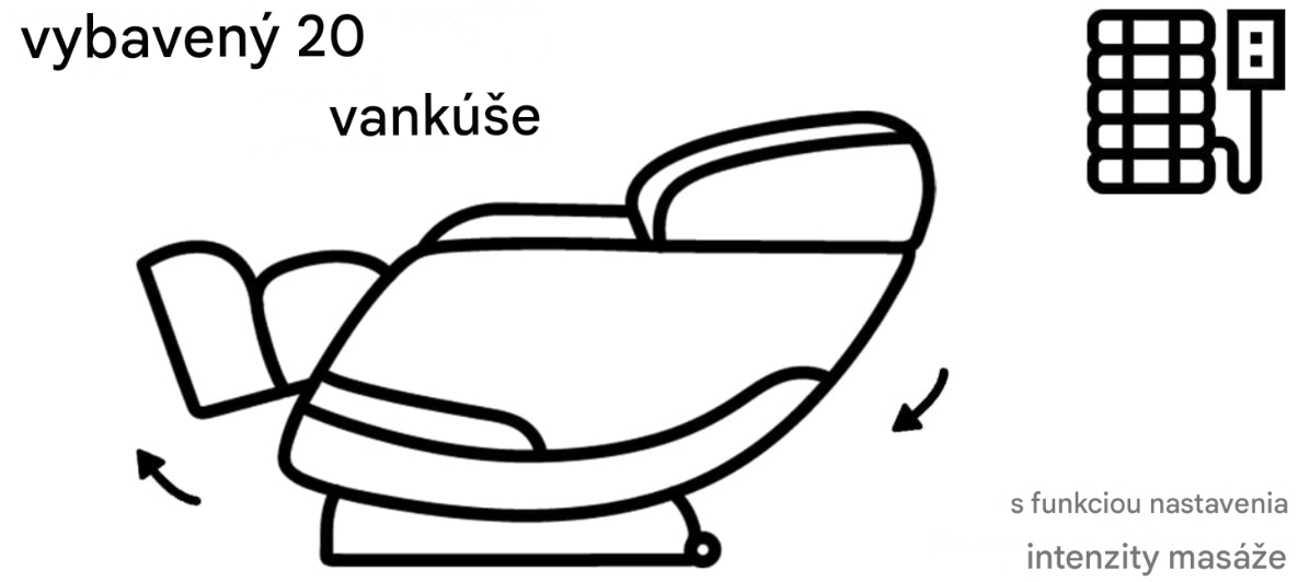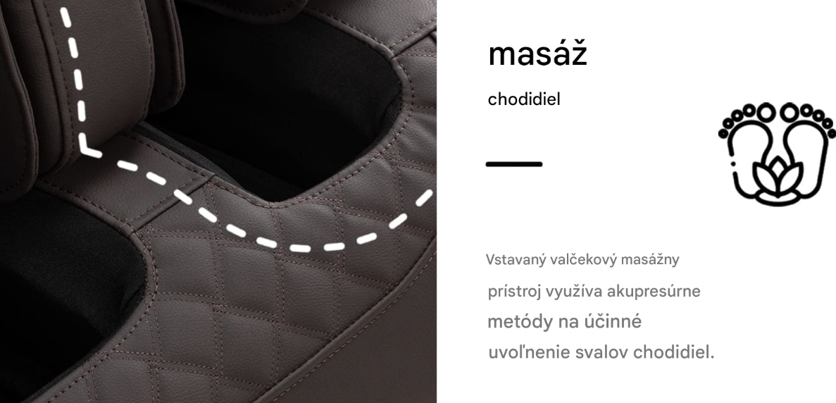 Pokročilý masážny mechanizmus poskytuje účinnú a relaxačnú masáž svalov . Desať masážnych hlavíc dôkladne prepracuje chrbát a zadok a napodobňuje pohyby ľudských rúk. Pomocou techník miesenia a tlaku masáž podporuje kondíciu tela, znižuje bolesť a prináša úľavu napätým svalom. Po každom sedení si všimnete citeľné zníženie svalového napätia, vďaka čomu bude vaše telo príjemne uvoľnené a svieže. Vstavaný valčekový masážny prístroj na chodidlá navyše využíva akupresúru , ktorá účinne uvoľňuje svaly, zmierňuje únavu a zlepšuje celkovú pohodu.