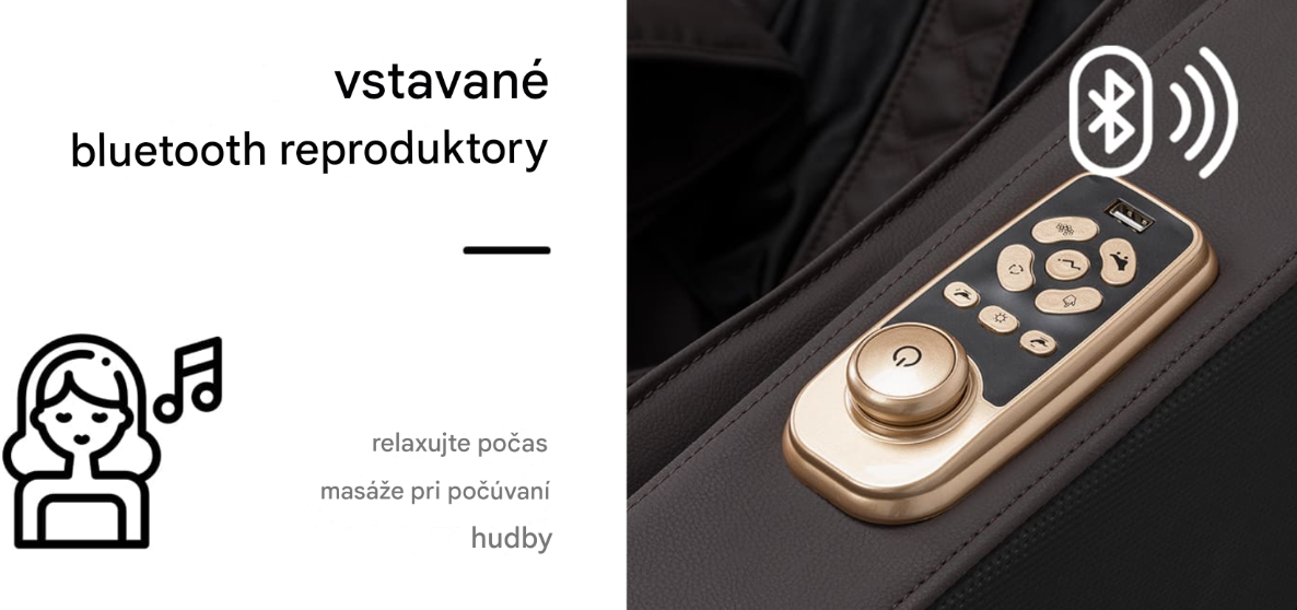 Pre ešte väčšie pohodlie a hlbšiu relaxáciu ponúka masážne kreslo možnosť prehrávať si počas sedenia vašu obľúbenú hudbu. Technológia Bluetooth vám umožňuje jednoducho pripojiť telefón ku kreslu a prehrávať vaše obľúbené skladby prostredníctvom vstavaných reproduktorov . Upokojujúca hudba je dokonalým doplnkom masáže – zlepšuje vašu pohodu , umožňuje vám uniknúť od každodenných starostí a poskytuje relaxáciu nielen telu, ale aj mysli .