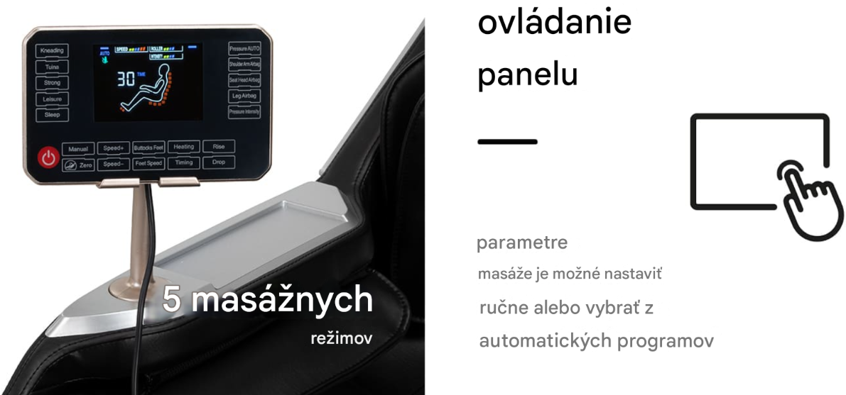 Prehľadný ovládací panel s ľahko čitateľnou obrazovkou LCD zaisťuje intuitívne ovládanie kresla. Možno ho pohodlne umiestniť do rukoväte na pravej podrúčke alebo držať v ruke. Displej zobrazuje informácie o práve masírovanej časti tela, intenzite masáže, dĺžke trvania seansy a zvolenom programe. Pomocou panelu je možné ľahko nastaviť polohu sedadla, zvoliť preferovaný režim masáže a nastaviť dobu ošetrenia - 15, 20, 25 alebo 30 minút.