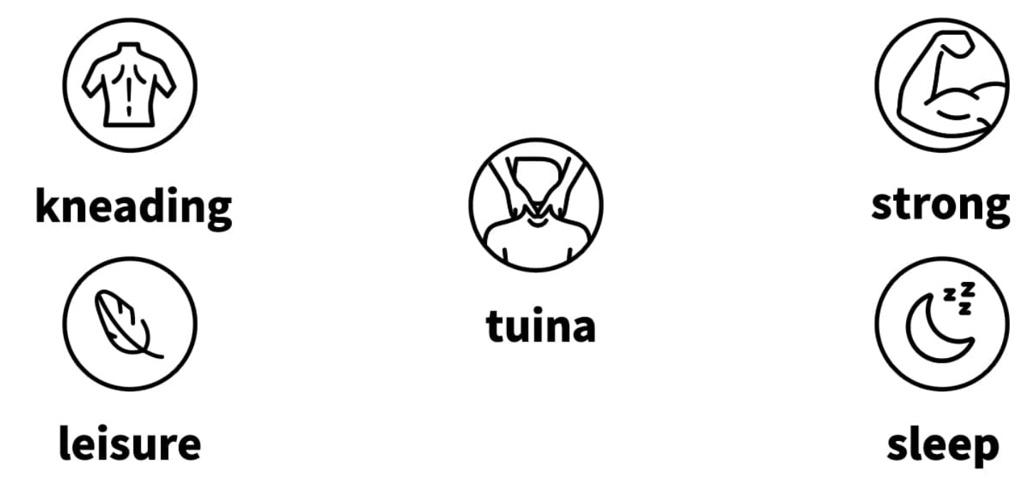 - Tuina (Tui Na) - Zameraný na oblasť šije a ramien so stredne intenzívnou masážou. Podporuje regeneráciu svalov, zlepšuje krvný obeh a uľahčuje zaspávanie.