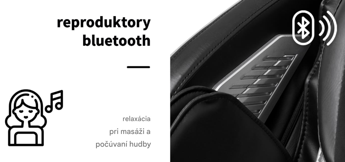 Vďaka vstavanej funkcii Bluetooth je možné kreslo pripojiť k mobilnému zariadeniu a počas masáže si pustiť obľúbenú hudbu. Pokojné zvuky podporujú relaxáciu, zlepšujú náladu a umožňujú odpútať sa od každodenných podnetov. Kombinácia masáže a zvukovej terapie podporuje hlboký pokoj a regeneráciu tela i mysle.