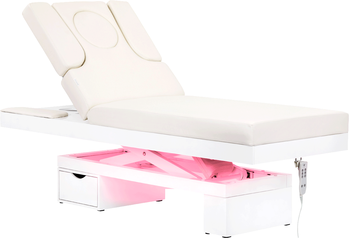 Nové kozmetické lehátko. Absolútny hit medzi lehátkami. Elektrické nastavenie výšky vo veľmi širokom rozsahu - od 58 do 85 cm. Opierka chrbta je tiež nastaviteľná pomocou diaľkového ovládača, z horizontálnej polohy do takmer vertikálnej (dvíha sa do 80 stupňov). Možnosť posunutia do strany alebo úplnej demontáže bočných dielov opierky. Jeden vankúš je súčasťou. V spodnej časti pod operadlom sa nachádza zásuvka na šikovné príslušenstvo. Široký kus nábytku (76 cm), s hrubým a veľmi pohodlným matracom. Lehátko je velmi stabilny. Má poťah z kvalitnej ekokože v jemnom odtieni ecru.