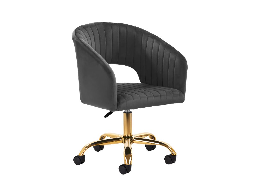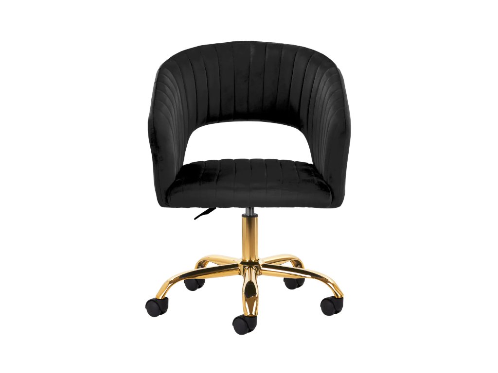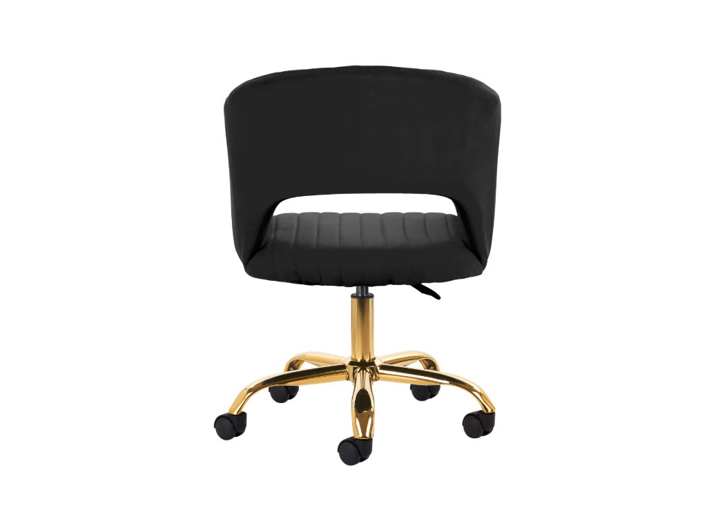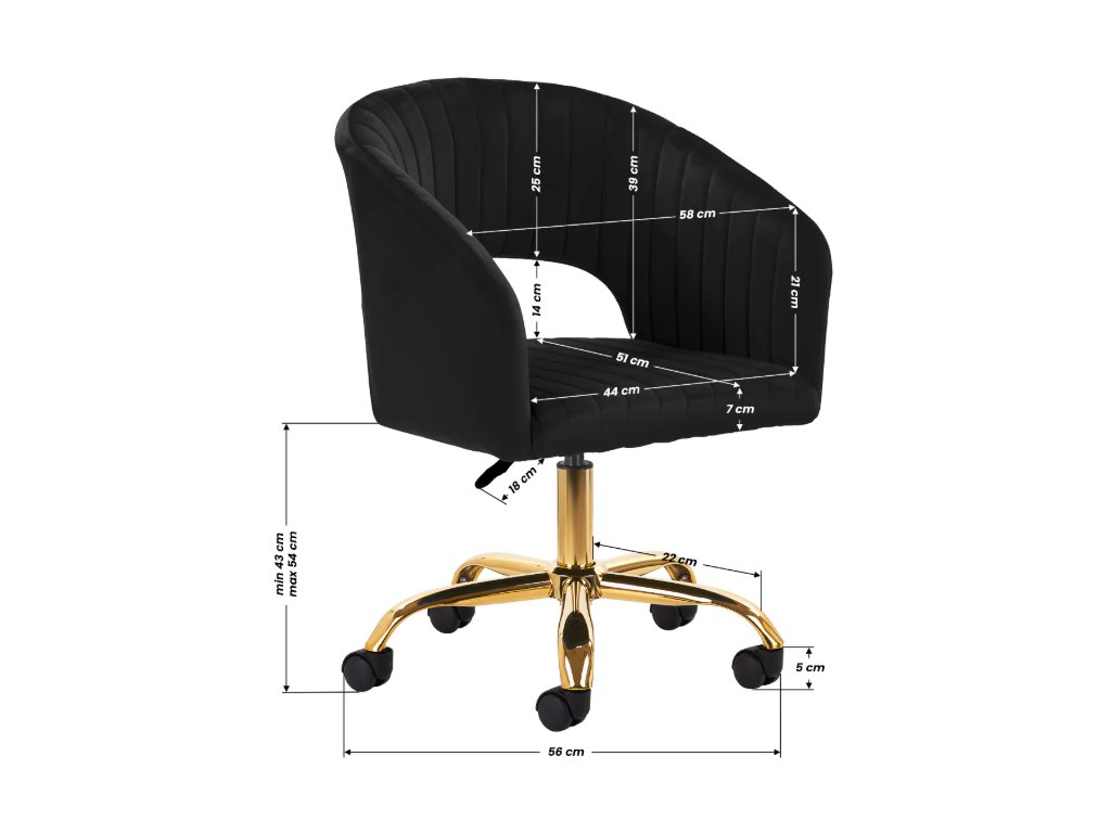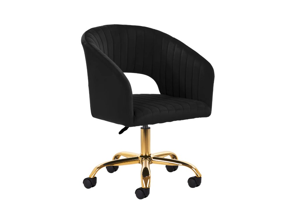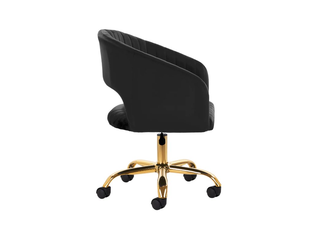 Vďaka precíznej povrchovej úprave je tento kus nábytku pútavý. Mäkké zamatové čalúnenie v odtieňoch čiernej mu dodáva jedinečný charakter . Zlatá základňa dodáva eleganciu a dokonale dopĺňa zamat, zatiaľ čo funkčné kolieska zaisťujú mobilitu , vďaka čomu sa stolička ľahko presúva a pohybuje sa po obývačke počas práce. Estetika, pohodlie používania, ozdobné šitie a ergonomicky tvarované operadlo zaručujú, že stolička splní požiadavky aj tých najnáročnejších používateľov .