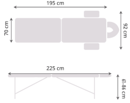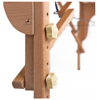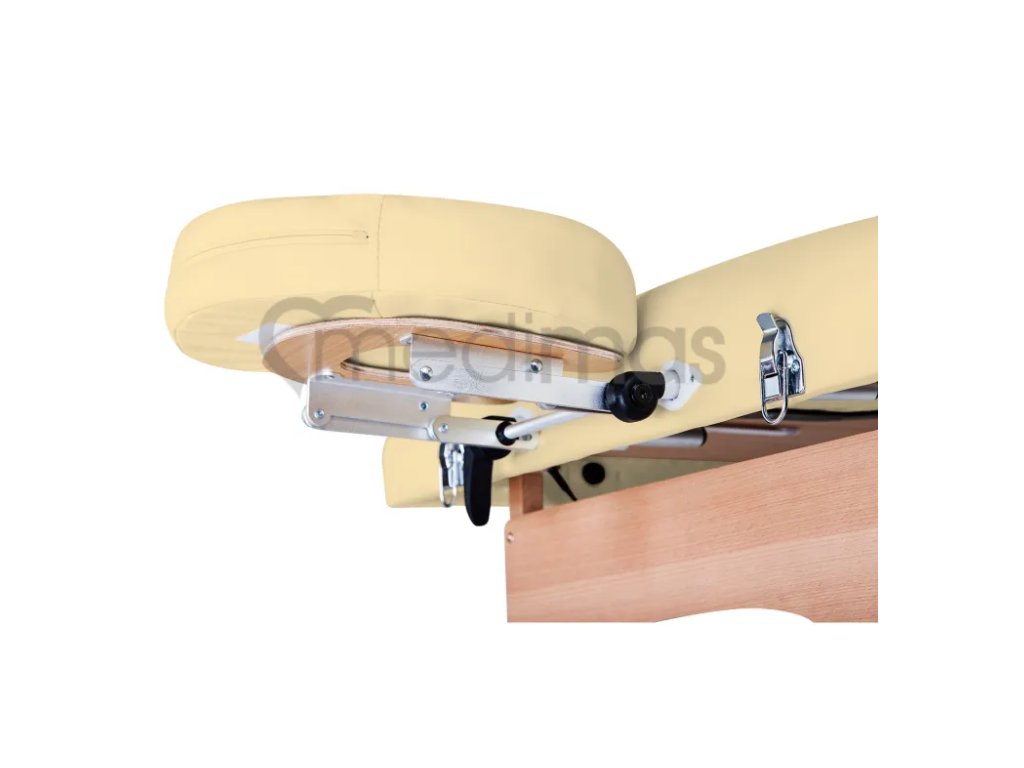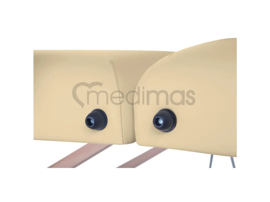Frézované nohy z odolného bukového dreva s protišmykovými koncami ďalej stabilizujú konštrukciu stola a zabraňujú jeho posunutiu počas liečby. Výšku pohovky je možné nastaviť v rozsahu 61 – 86 cm pomocou dvoch krídlových matíc, ako je znázornené na fotografii.