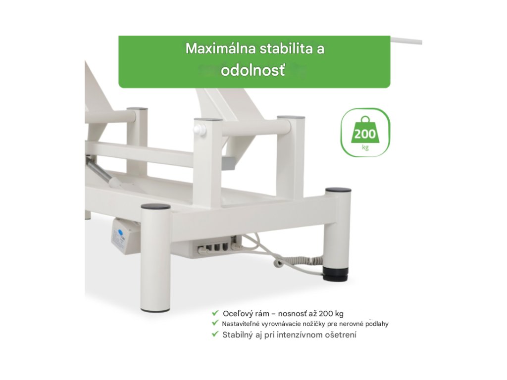 Stôl Optima bol navrhnutý tak, aby poskytoval vynikajúcu stabilitu a pevnosť. Zosilnený rám unesie maximálne zaťaženie až 200 kg, čo zaisťuje bezpečnosť počas ošetrení, a to aj pre pacientov s vyššou telesnou hmotnosťou. -