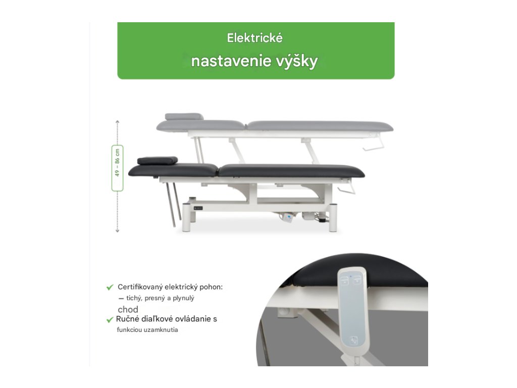 Stôl Optima je vybavený tichým, certifikovaným elektrickým pohonom, ktorý umožňuje presné nastavenie výšky od 49 cm do 86 cm, čím zaisťuje pohodlné pracovné podmienky pre terapeuta a maximálne pohodlie pre pacienta. -