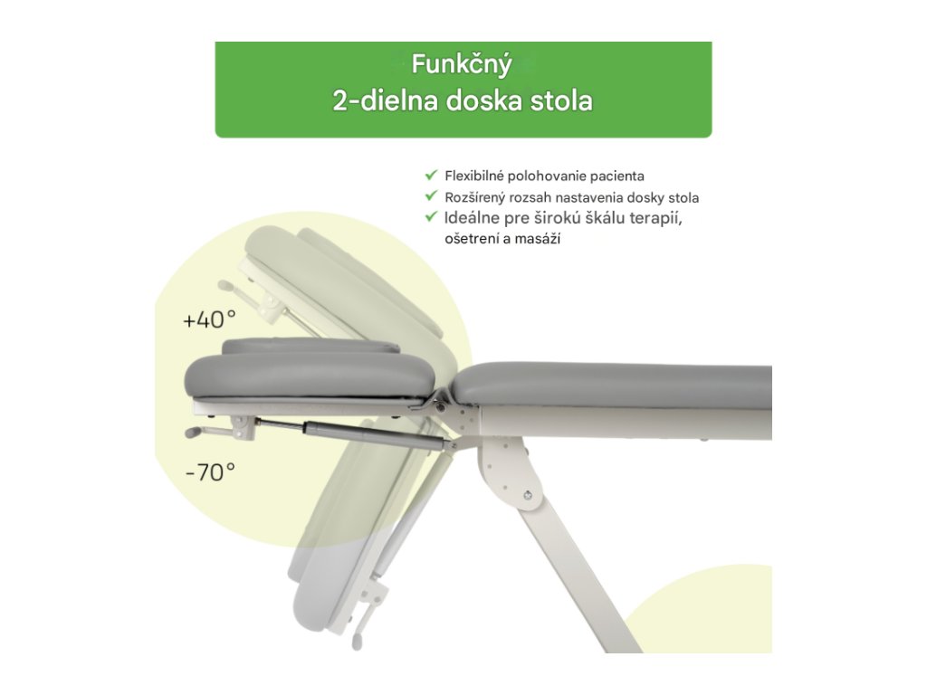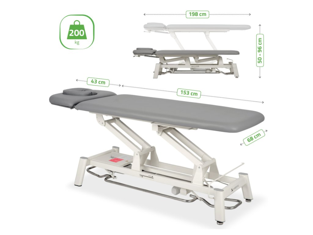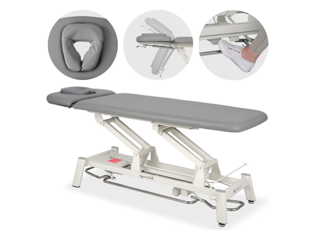 Vďaka dvojdielnej doske stola, elektrickému nastaveniu výšky a ergonomickým prvkom tento model poskytuje bezpečnosť, maximálne pohodlie pacienta a optimálne pracovné podmienky prispôsobené individuálnym potrebám každého terapeuta.