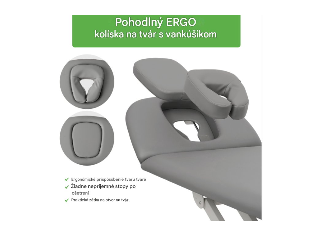 - Pohodlná dvojdielna doska stola s nastaviteľnou opierkou hlavy: Umožňuje presné a pohodlné polohovanie pacienta, čím zvyšuje účinnosť terapeutických sedení.