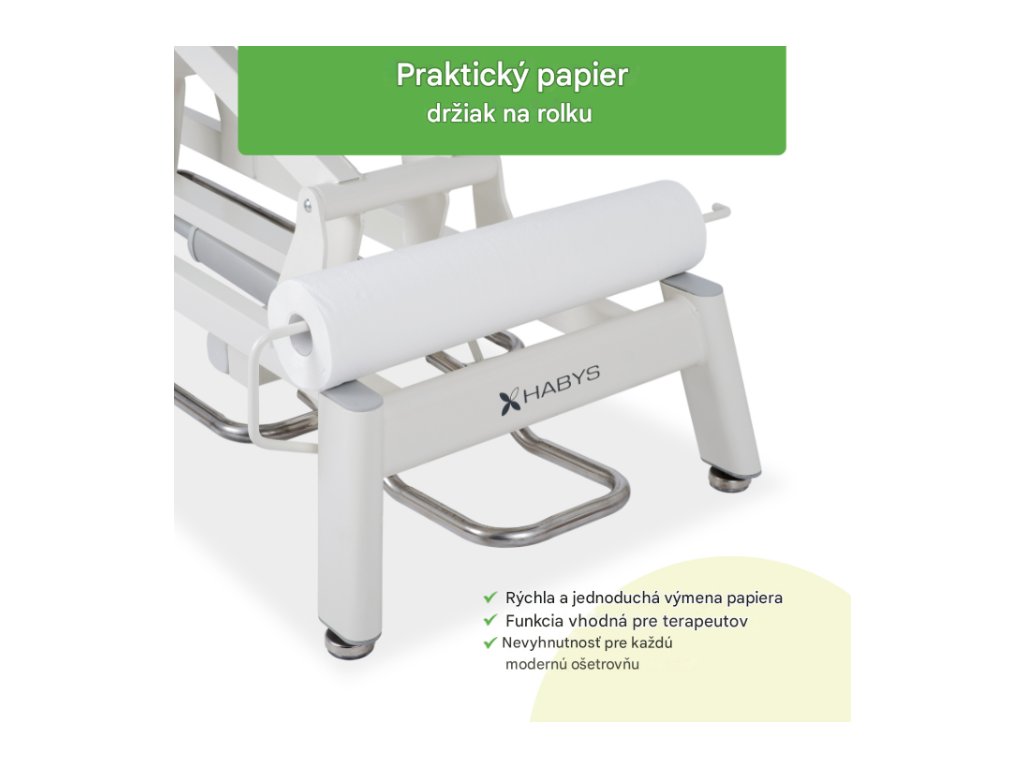 - Držiak na papierové rolky: Praktické príslušenstvo pre rýchlu a hygienickú výmenu papierových listov medzi jednotlivými ošetreniami.
