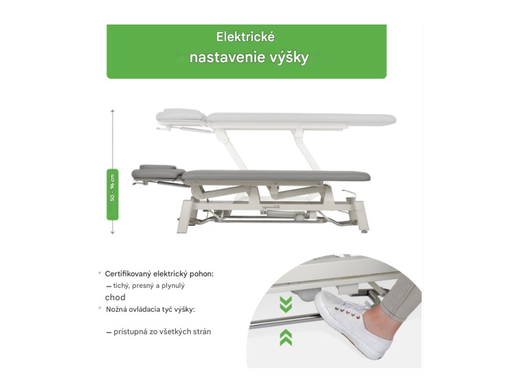 - Elektrické nastavenie výšky: Certifikovaný elektrický pohon zaisťuje plynulé, presné a tiché nastavenie výšky v rozsahu 50 – 96 cm, čím poskytuje pohodlie terapeutovi aj pacientovi. Umožňuje vám jednoducho prispôsobiť výšku stola vašej pracovnej polohe – chráni vašu chrbticu a zlepšuje ergonómiu. Nízka poloha uľahčuje a bezpečnejšie nastupovanie a zostupovanie pacientov z terapeutického stola.