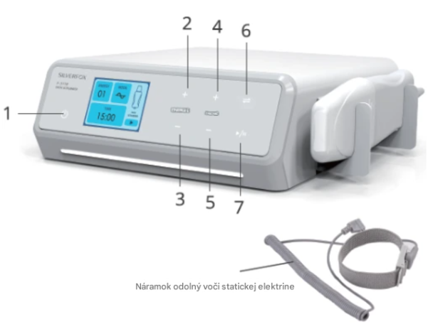 7. Stlačením vypínača zariadenie po skončení ošetrenia vypnite. Vypínač sa v tomto okamihu rozsvieti na červeno. Po odpojení zástrčky zo zásuvky očistite špachtľu a antistatický náramok 75% alkoholom a uložte ich na suchom mieste.