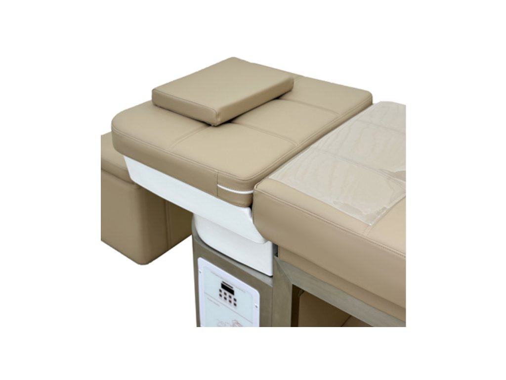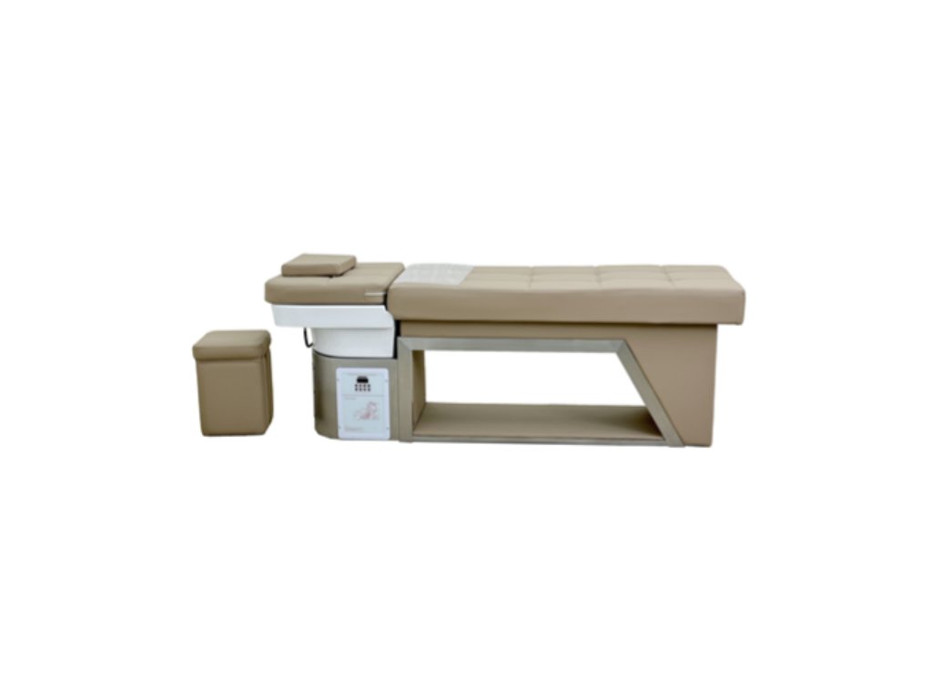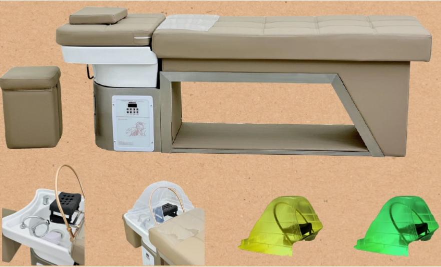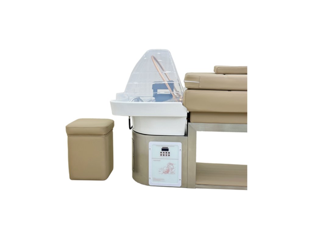 Head Spa kombinuje robustnú konštrukciu z nerezovej ocele s pružinovým polstrovaním interiéru a ponúka plne prispôsobiteľné vodné a parné vlasové procedúry – to všetko bez kompromisov v pohodlí zákazníka alebo profesionálnej ergonómii. Súčasťou je sprchová hlavica s ochranou proti odkvapkávaniu, ktorá po dokončení inštalácie vody umožňuje použitie ako konvenčná šampónovacia stanica.